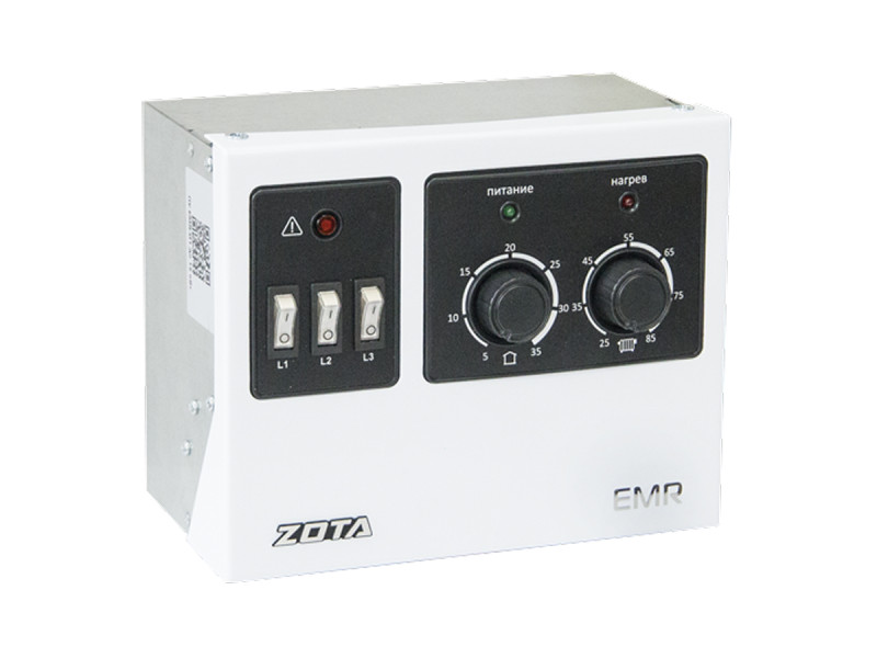 Панель управления ПУ EMR-И1 предназначена для управления электрокотлами мощностью до 9 КВт. Является комплектующим изделием электрокотлов ZOTA «Econom». Панель управления обеспечивает оптимальную работу системы в заданных Вами режимах, автоматически поддерживая температуру воздуха в помещении от +10 до +35°С и воды на выходе из котла от +40 до +90°С. Наличие ступеней мощности позволяет более экономно использовать потребляемую электроэнергию. Необходимое количество работающих ступеней мощности выбирается вручную с помощью переключателя.